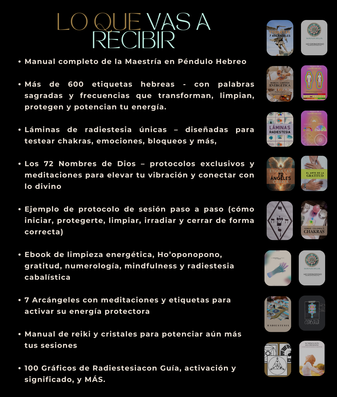Sí. Vas a recibir más de 600 etiquetas energéticas listas para imprimir y gráficos exclusivos de radiestesia (chakras, bloqueos, emociones y más). Todo lo necesario para empezar a aplicar la técnica de inmediato.